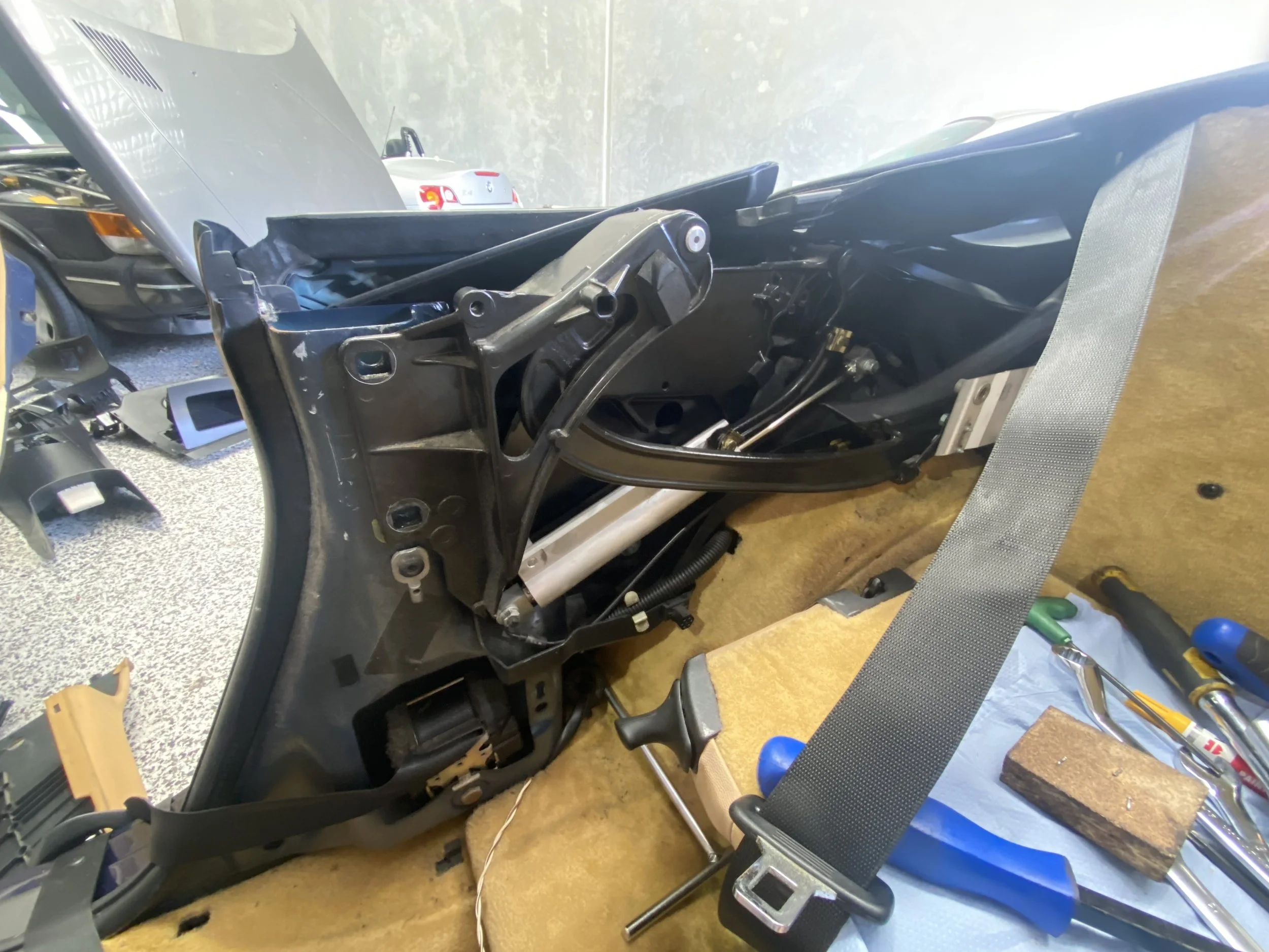 Brief: Repair RHR 1/4 glass. The regulator failed whilst the Cabriolet soft-top was in use.