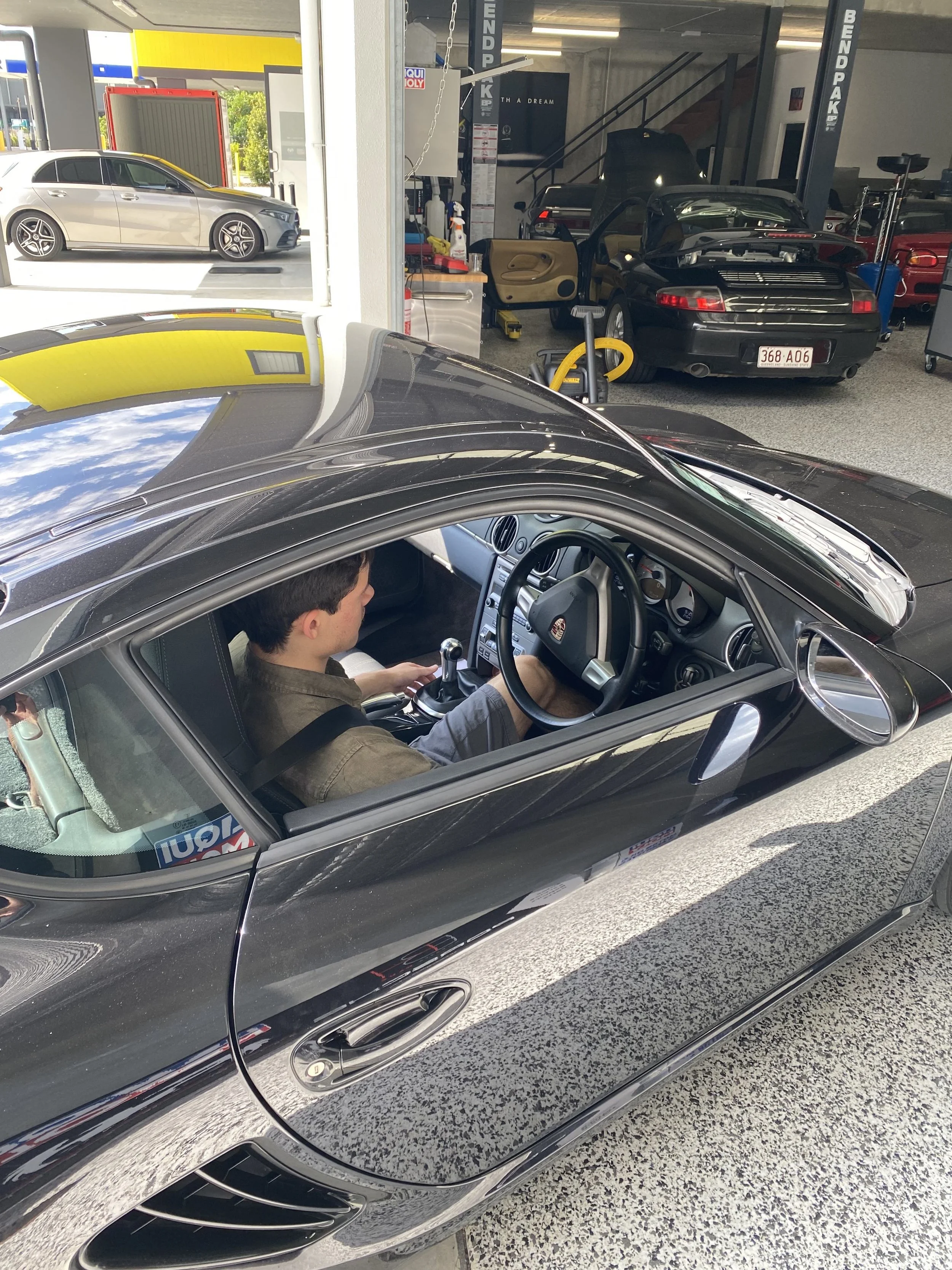 Notes: Image 1, Kevin’s lovely Cayman S. Extremely fast example. 2 Top engine inspection 3 Front Strut bump stops/bellows 4. Julian is back from a test drive. With a big smile!